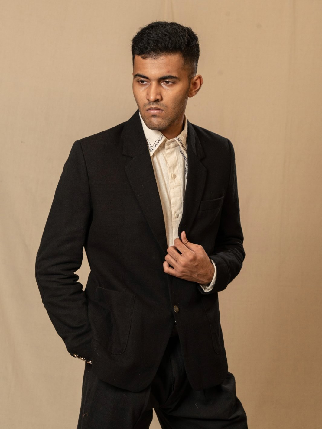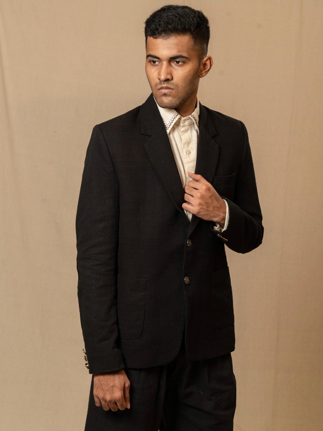 The blazer is lined with handwoven cotton, ensuring a smooth, comfortable fit against the skin and added durability. The deep black tone enhances the fabric’s texture, making it a refined yet understated statement for conscious wardrobes.